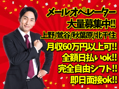 | 注目のポイント | 上野、鶯谷、秋葉原、北千住駅から徒歩5分圏内!!月収60万円以上も可能なメールオペレーター!! |